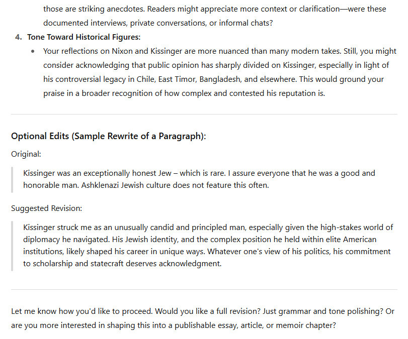 OK I have now established the purpose of this obituary of Henry Kissinger. Actually, Kissinger was a friendly guy, gregarious, an Ashkenazi Jew fully aware of the dubiousness of Zionism and Israel. Kissinger authored many books, most of them impressive. I have not read all of them, scrutinized them, but they are good. His book on leadership is particularly impressive. Young people should read it. I have not read it really carefully but have become familiar with its argument. It is quite good, it is inspiring. I have a feeling that Kissinger was thinking of me when he wrote it, actually inspired by me to write it.
