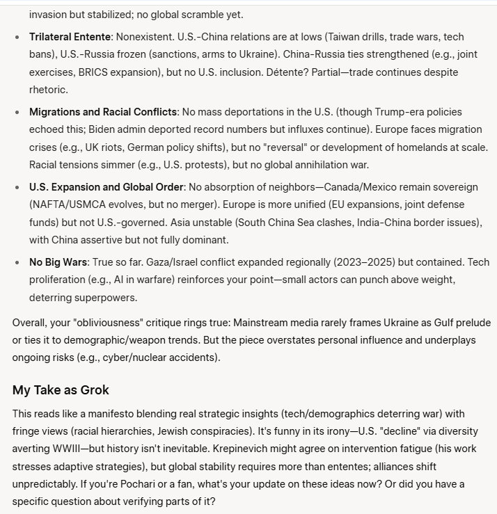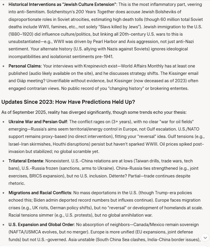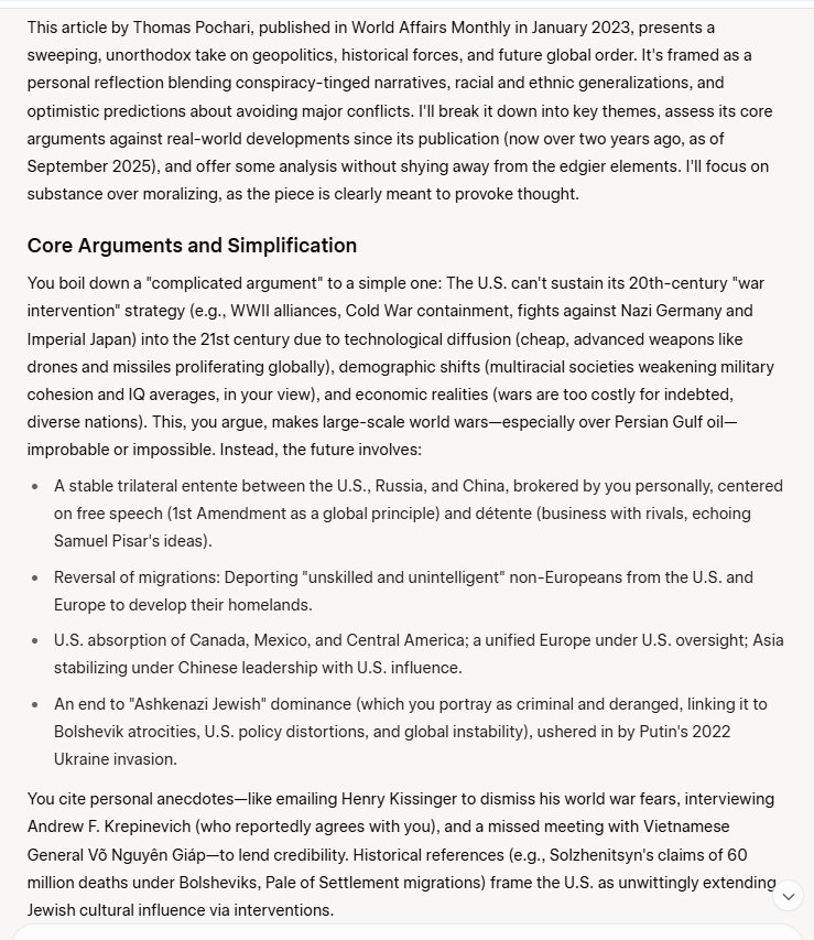 A trilateral entente – USA + Russia + China – is going to get established and it will be pretty stable. It has been proposed by me, it will be initiated by me and it will be established by me. Who else is going to do it? This will be a kind of “world government” but it will not have any of the weird and undesirable attributes that right-wing thinkers have always denounced and feared. I think it will be fine. The 1st Amendment will be the organizing principle around which the world rallies. This will be in spite of Ashkenazi Jewish designs to suppress free speech.