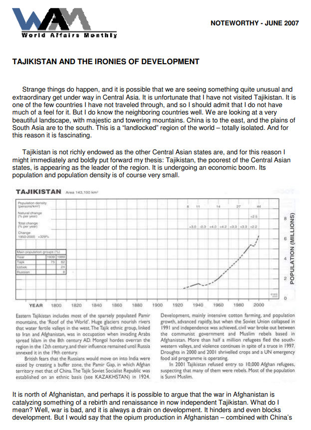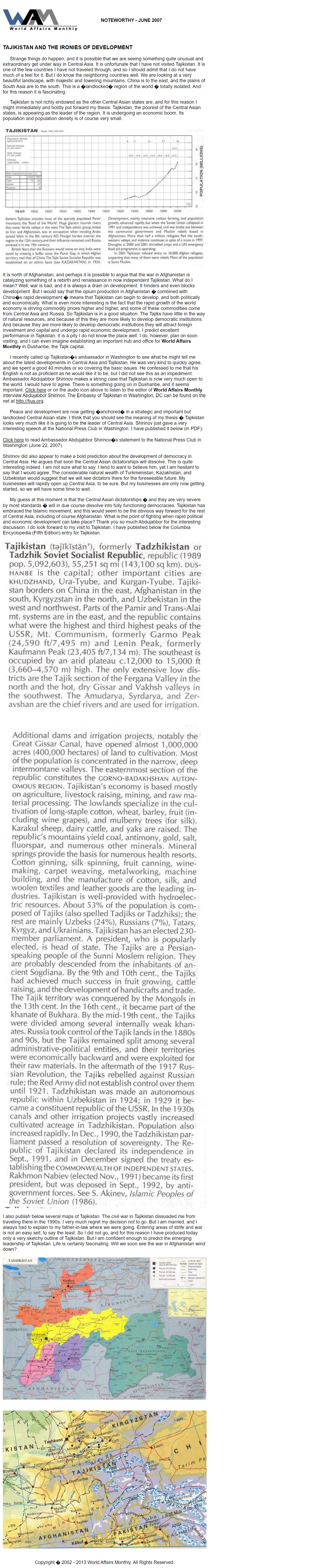 I have published below as an image the original June 2007 World Affairs Monthly article that accompanies the interview with Mr Shirinov. You should find it interesting. Journalism is often a surprise. My views have changed over the years and I do not any longer advocate any kind of democratic institutions for Central Asian states. These people require development dictatorships. And it seems they are going to get them. The world has changed. It is unbelievable and it is rather awesome.