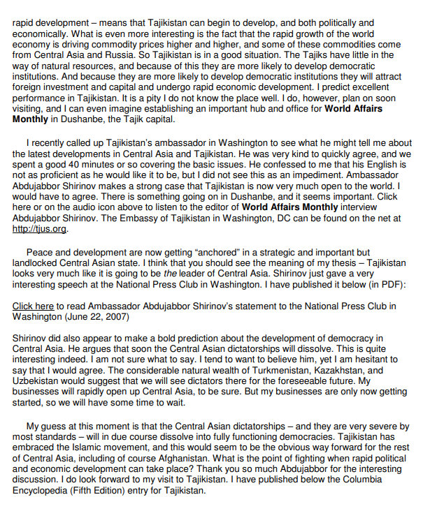 As far as Mr Shirinov is concerned, I did not maintain contact with him and I noticed just now that he was [from 2012-2015] the central bank governor of Taijikstan. He's an economist – so this is why we got along so well. It appears that the Embassy of Tajikistan in Washington does not at this time have an ambassador in Washington. I'm not sure what's going on in Tajikistan. I have called the embassy several times, emailed them, no response yet. It appears that Mr Emomali Rahmon is still pretty much the uncontested head of state. I am pretty sure he was head of state when I talked to Mr Shirinov. I will have to see if I can get in touch with my friend Mr Shirinov.
