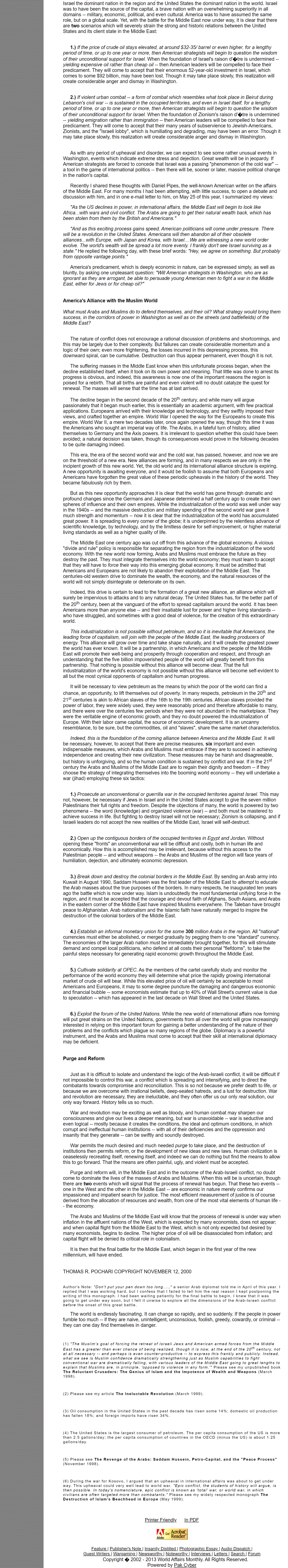 This “monograph” made me pretty famous – in the Arab world but really everywhere. I gave it the title The Logic of the Arab-Israeli Conflict: Oil, Alliances, and the Dollar. I finished up writing it in November 2000. I have vague memories of putting the last words together and editing it for clarity etc. I knew I had a very powerful piece of writing, a powerful argument. At least this is what I sensed.