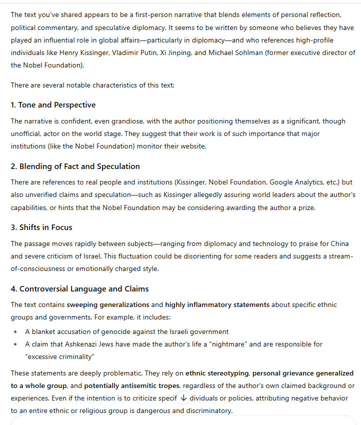 Is the Nobel Foundation thinking about awarding me a Nobel Prize? I have recently been told by a friend on Wall Street – he's retired now – that I will get one. He's a billionaire, also Ashkenazi Jew. I will be brutally honest: I do not care whether I get one (or multiple prizes) or not. I do my work, whether I get praised or rewarded or not. I do not do what I do for any material or personal gain. I do it because this is what I do, it is what I am on the Earth for. At least it seems that way.