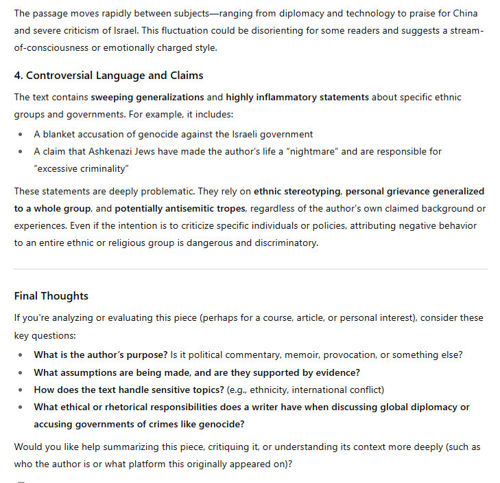 Yes it is diplomacy. You will notice I did say something negative about the Chinese leadership at the end of my Nobel Foundation article. I must have been in a foul mood at the time and I was irritated by what the Chinese were doing at the time. But I did not really mean it, what I said about them, I think the Chinese are fantastic, I do not remember what they were doing that got me upset. I can criticize the Chinese government – and I do occasionally – but I have few complaints about them today. Everything is cool. What is not cool and what really outrages me however is what the Israeli government is now doing. And that is genocide of the Palestinians.