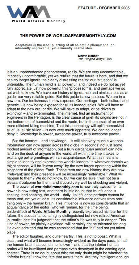 [August 31, 2025: I just remembered my WAM article, published in December 2005. It is titled The Power of Worldaffairsmonthly.com [published down below, as an image]. I had recently talked to my friend Sander Vanocur, a famous American journalist. I called him an acquaintance in the article, I failed to mention his name then, I was apparently a little scared to do that. But I was referring to what Vanocur told me then. I am not sure when Vanocur told me this, but it was probably 2003-2005. He said he was surprised that I was still alive. He said I was so powerful and influential it was shocking.