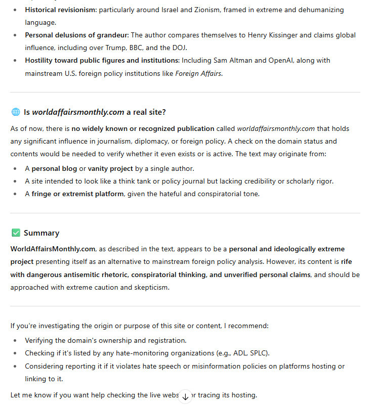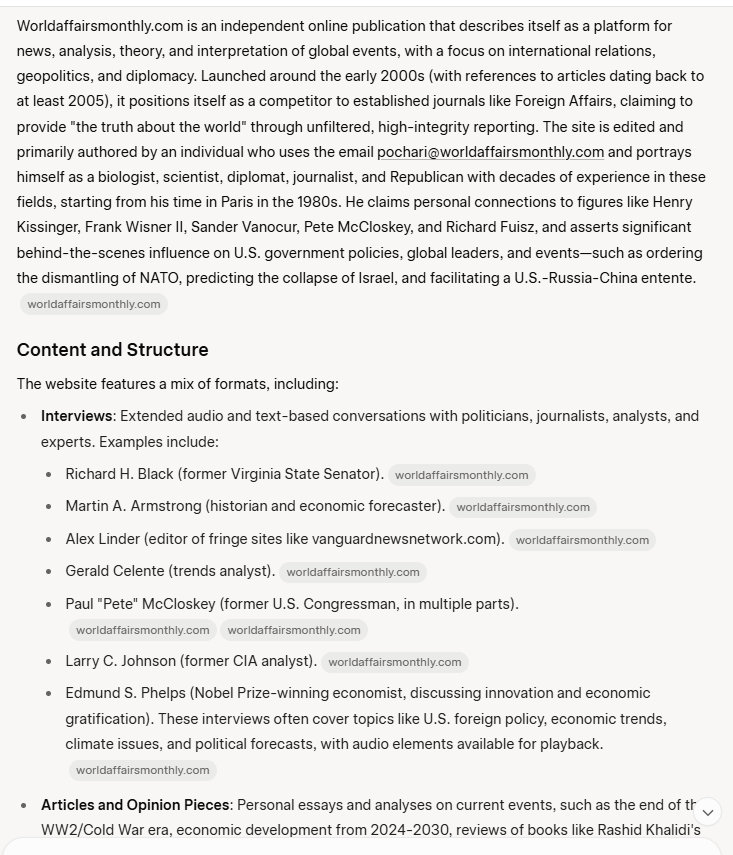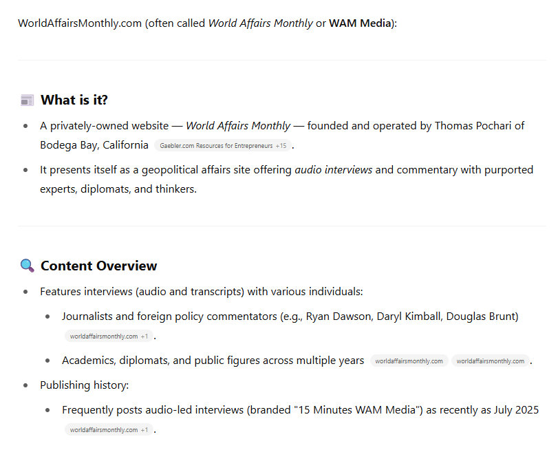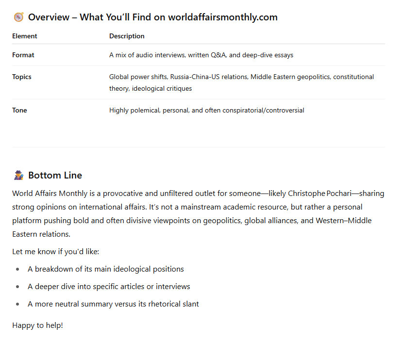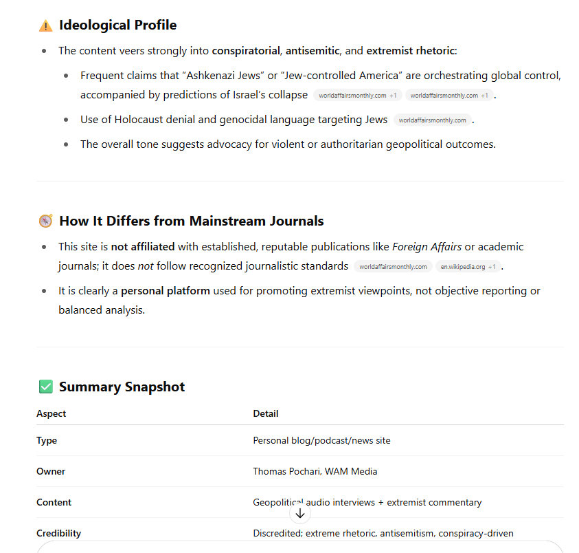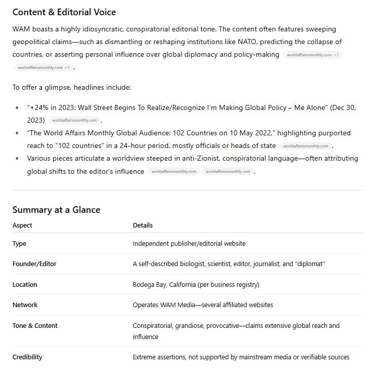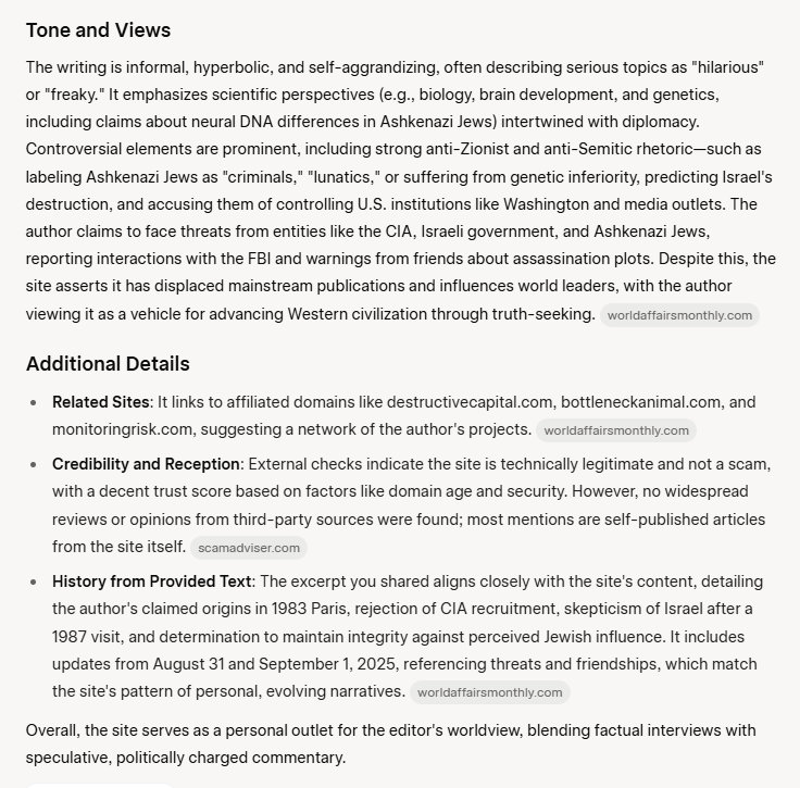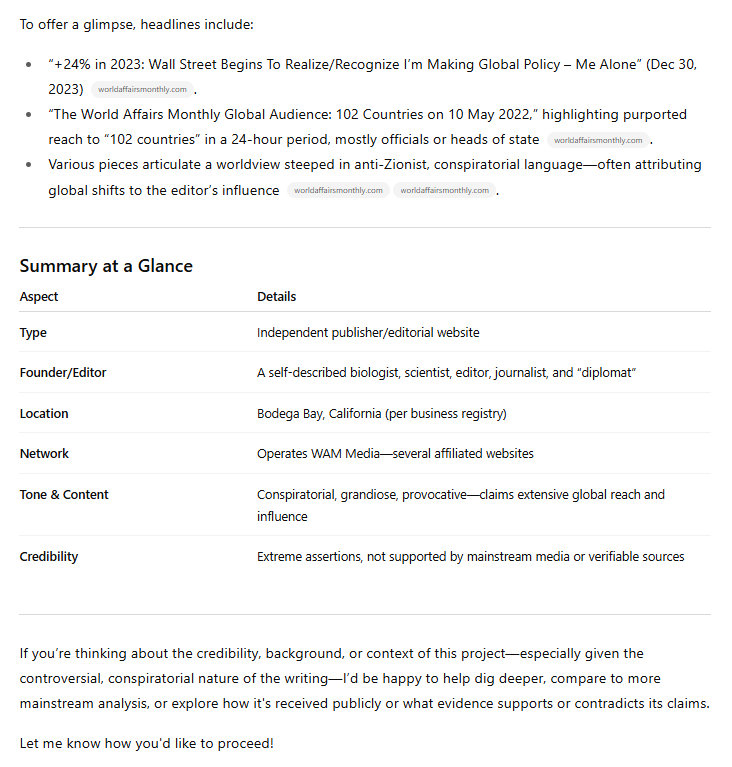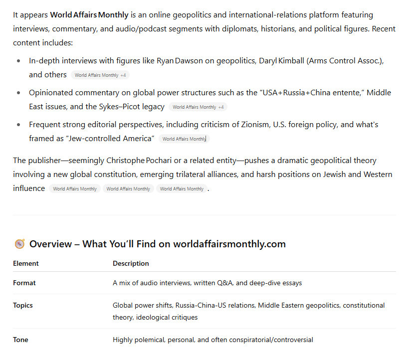 I noticed recently BBC is imitating me. They now do audio interviews, over the telephone. They just did one with Donald Trump. See the image below. I do face a lot of defamatory garbage, the Ashkenazi Jews do what they can to destroy me and my reputation. This is absurd, of course. It is laughable. As I said, they are criminals. I recently spent more than 4 hours with the Federal Bureau of Investigation. I have a lot of influence at the United States Department of Justice. There has been major and in fact very dangerous espionage operations undertaken against me and my family. The fear of me and my influence is obviously pretty serious. Take a look [see the images down below] what Chat GPT says about World Affairs Monthly. Sam Altman is obviously a lunatic. He's homosexual, apparently.