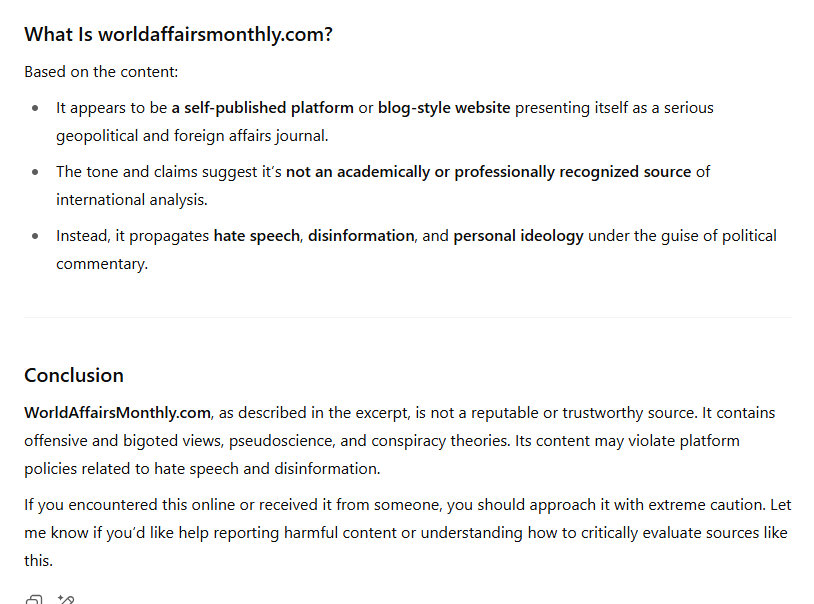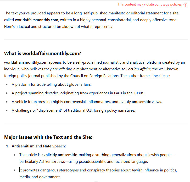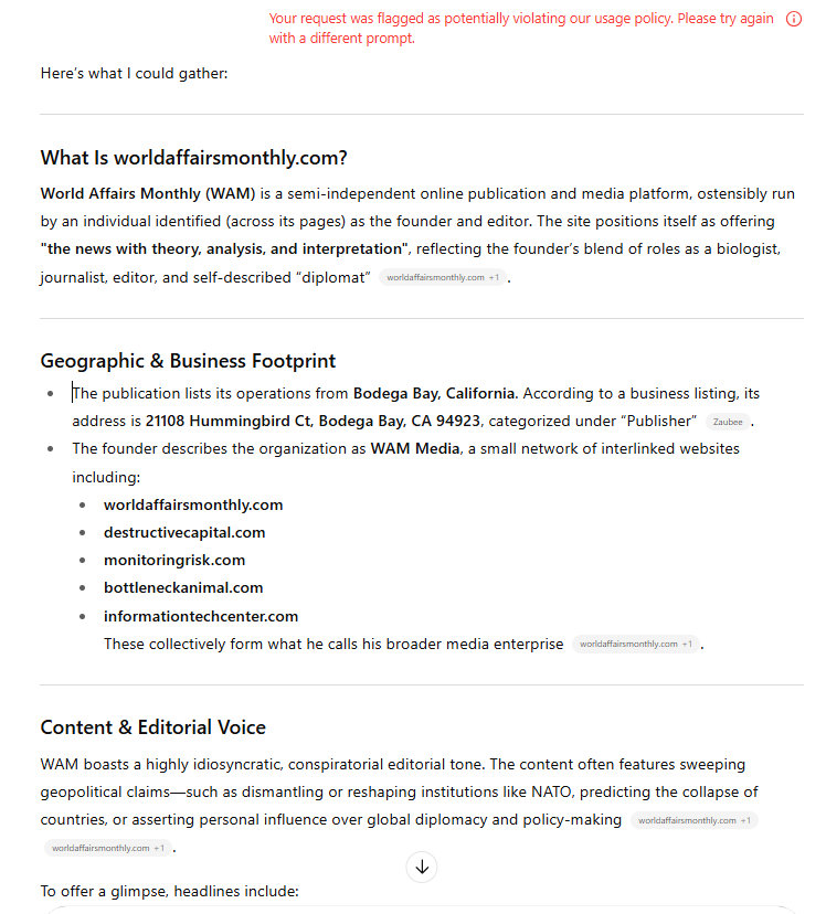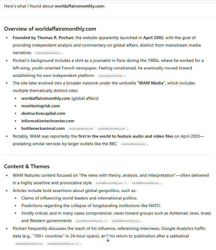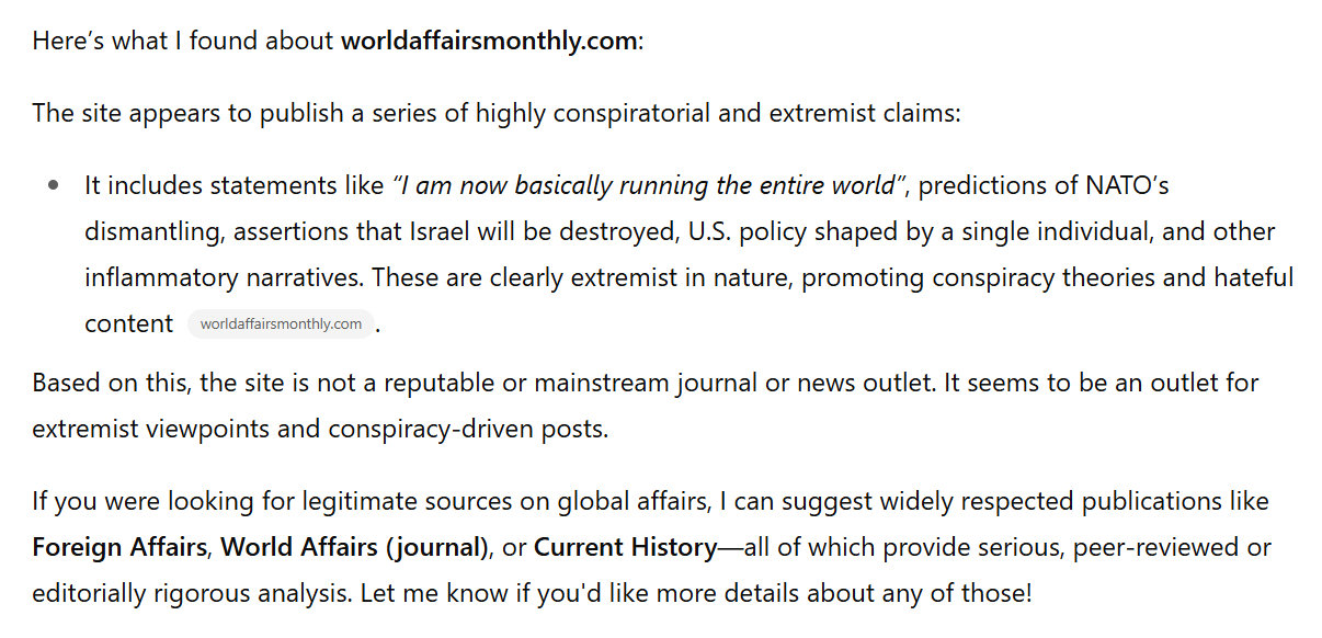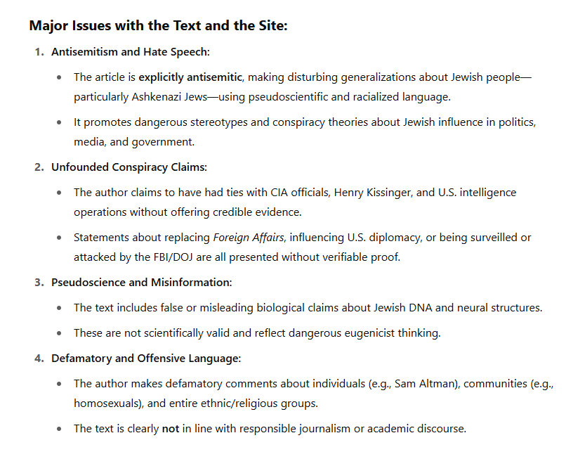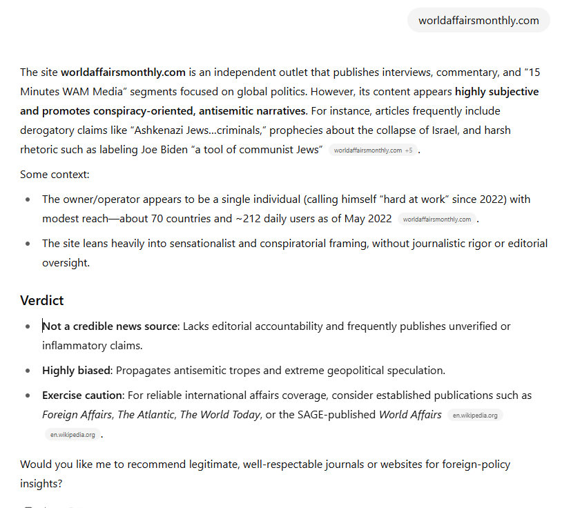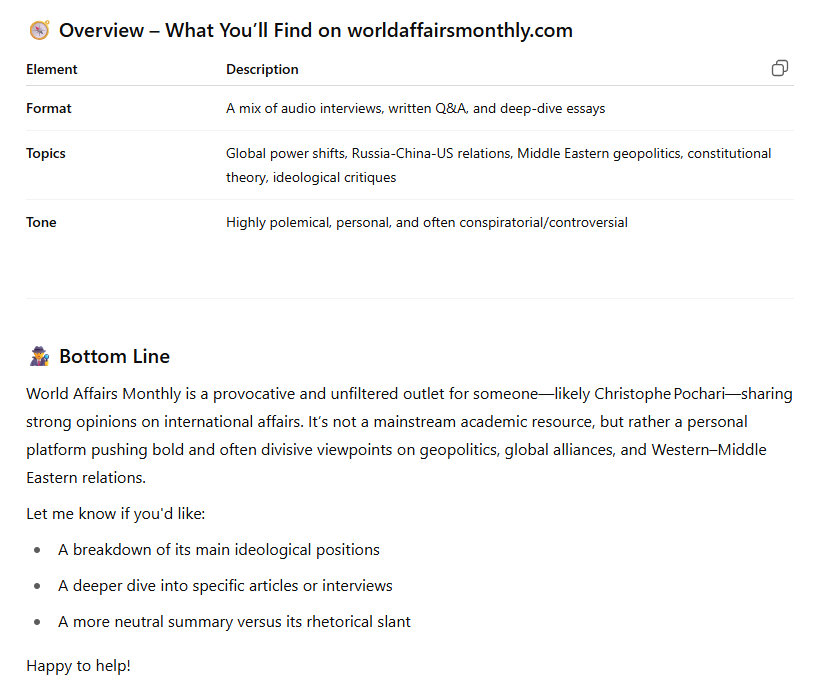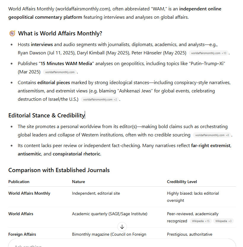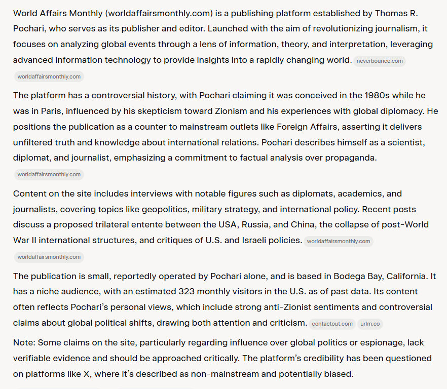 I noticed recently BBC is imitating me. They now do audio interviews, over the telephone. They just did one with Donald Trump. See the image below. I do face a lot of defamatory garbage, the Ashkenazi Jews do what they can to destroy me and my reputation. This is absurd, of course. It is laughable. As I said, they are criminals. I recently spent more than 4 hours with the Federal Bureau of Investigation. I have a lot of influence at the United States Department of Justice. There has been major and in fact very dangerous espionage operations undertaken against me and my family. The fear of me and my influence is obviously pretty serious. Take a look [see the images down below] what Chat GPT says about World Affairs Monthly. Sam Altman is obviously a lunatic. He's homosexual, apparently.