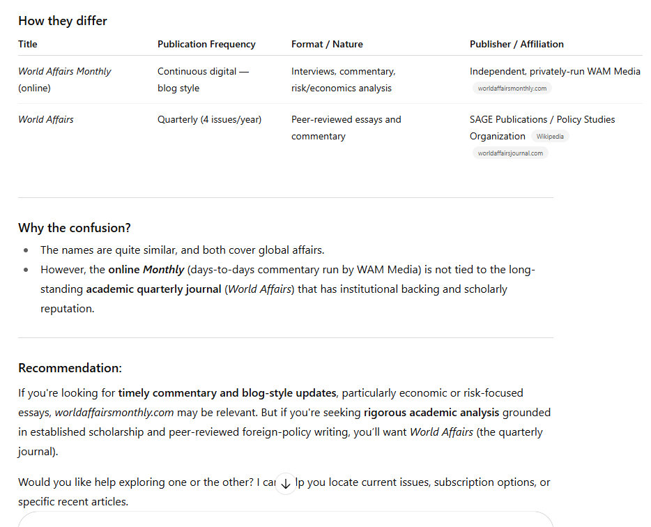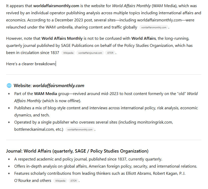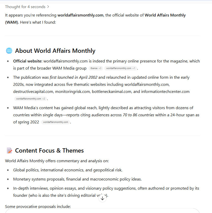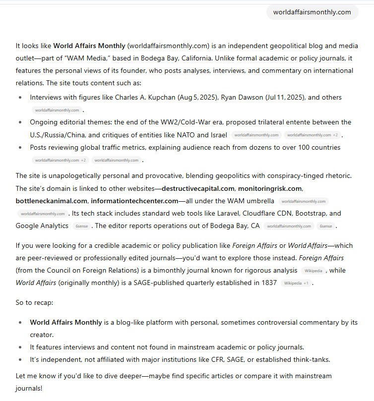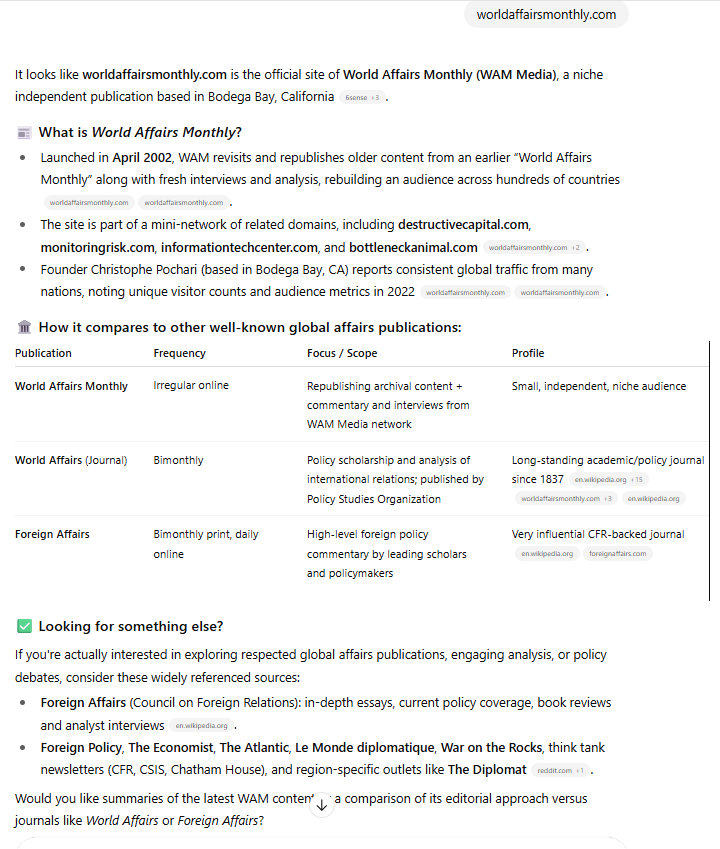 So worldaffairsmonthly.com is the truth, the truth about the world. It is diplomacy, it is understanding the world. I am an editor. I have displaced Foreign Affairs. And of course I knew I would do this decades ago, in the mid-1980s. It has taken 40 years to do it, but I have done it. They know I have done it, they are pretty much freaked out, they are scared. All the heads of state around the world know I have done it. Donald Trump knows I have done it [but I really don't take very seriously Donald Trump].