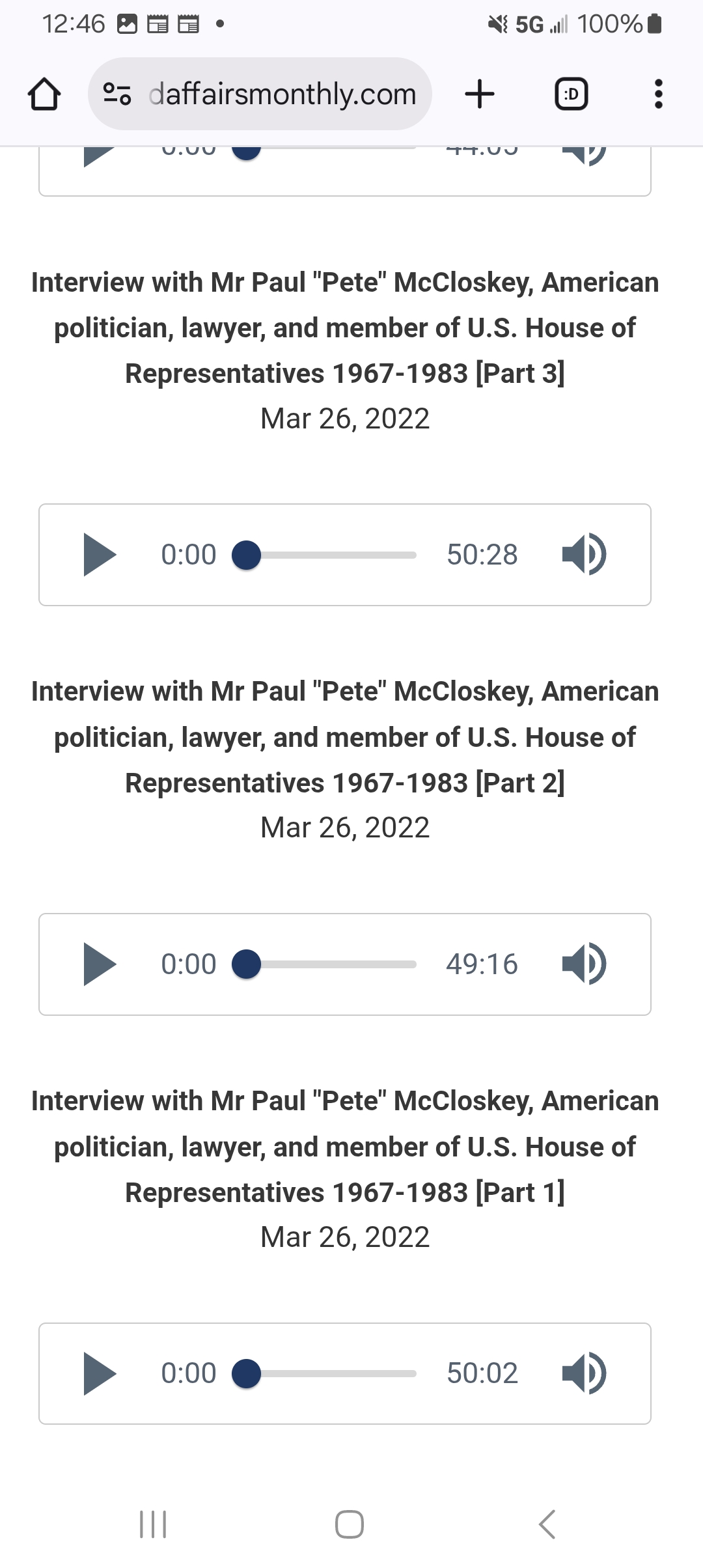 [September 1, 2025: Sander Vanocur was really serious about what he told me, of course. I am not exaggerating. Vanocur and I were good friends, as I mentioned. But I almost forgot to mention two other men, and their comments to me, about the threats I face. Pete McCloskey and I were good friends for about 23 years. McCloskey (September 29, 1927 – May 8, 2024) was a member of Congress from 1967 to 1983. He was a Republican. He was close to George HW Bush, also George W Bush. I drove over to Pete's home in Winters, in the central valley of California, on 26 March 2022. I did an interview in person. Published at worldaffairsmonthly.com. Pete unfortunately was slurring a lot when he spoke, and that was of course because of the stroke he was recovering from. His speech was slurred, but he was very sharp.